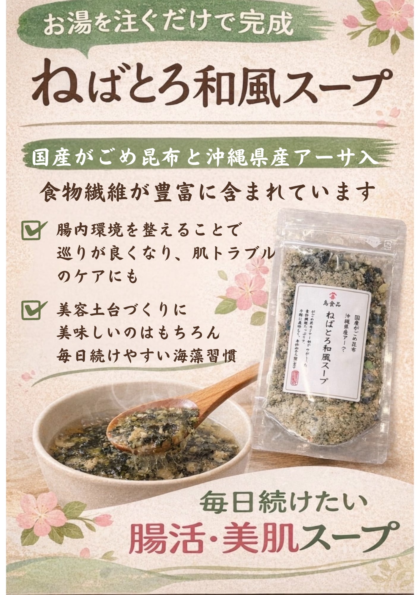 お湯を注ぐだけ!簡単に美味しいスープが完成しますので、忙しい日の食卓にもぴったり! 自然の恵みを活かした、ねばとろの特性が体に嬉しい一品。お味噌汁や具だくさんのスープとして、ご飯にかけたりと、使い方は多彩です。毎日の食事に、手軽に栄養をプラスするこのスープで、健康的なライフスタイルをお楽しみください!
